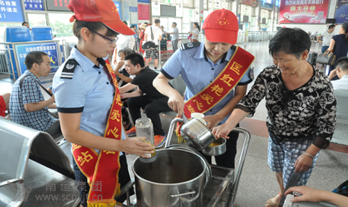 盛夏時(shí)節(jié),恰值每年暑運(yùn)高峰,在南充汽車客運(yùn)站內(nèi),數(shù)千旅客川流不息,奔波于各自的行程中。為做好旅客乘候車過(guò)程中站務(wù)服務(wù)工作,南充汽車客運(yùn)站組織“匡紅艷愛(ài)心班”自愿者服務(wù)隊(duì)員,利用業(yè)余時(shí)間熬煮綠豆南瓜湯,堅(jiān)持每天送到候車大廳、售票大廳,送到每一位需要的旅客手中。她們用愛(ài)心為候車的旅客送上了一絲絲清涼,一些旅客見(jiàn)此情景深受感動(dòng),一位趕乘蓬溪班車的旅客在連續(xù)喝了三杯后感慨地說(shuō)到“沒(méi)想到你們做得這么好,在其他地方我真還沒(méi)有見(jiàn)到過(guò)”。并問(wèn)道“你們是每天都送綠豆湯嗎”?愛(ài)心班的姐妹們回答到:“在夏日伏天中我們每天都要給旅客送到現(xiàn)場(chǎng),歡迎你下次來(lái)站飲用”。這位旅客連聲稱贊地說(shuō)“謝謝你們,有時(shí)間我一定在網(wǎng)上宣傳你們”!安挥茫灰銈儩M意就是對(duì)我們最好的肯定”。為旅客在候車的時(shí)候解除暑熱,帶來(lái)涼意,是愛(ài)心班姐妹們的心愿。當(dāng)志愿者們看到旅客喝著綠豆湯,倦意漸消的情景,她們倍感欣慰。她們知道在這“火熱”的盛夏里,送綠豆湯的小小舉動(dòng),溫暖了旅客們的心。 (張蜀慧 王洪)