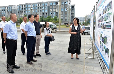 營山縣副縣長楊素梅(左一)在營山汽車客運(yùn)站站前廣場的展板前,向?qū)巿?jiān)一行介紹營山12328助力脫貧攻堅(jiān)工作開展情況。