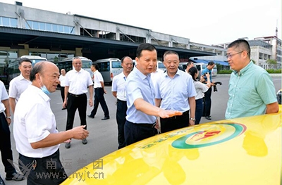 寧堅(jiān)(右三)一行在營山汽車客運(yùn)站“金通工程”車輛前,對營山12328助力脫貧攻堅(jiān)開展情況給予充分肯定。