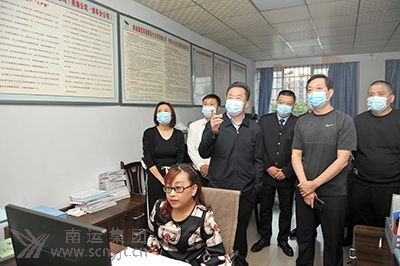 市委書記劉強(qiáng)(左四)在南運(yùn)集團(tuán)高速客運(yùn)分公司查看客運(yùn)車輛實(shí)時(shí)監(jiān)控視頻。