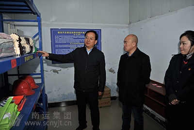 省總工會(huì)黨組成員、經(jīng)費(fèi)審查委員會(huì)主任張開鋒(左一),市總工會(huì)黨組成員、副主席屠繼東(左二),在南充汽車客運(yùn)站勞保庫房查看職工勞動(dòng)保護(hù)用品庫存情況。