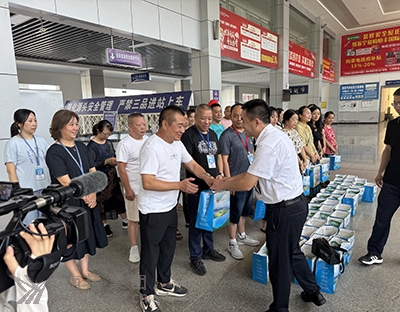 蓬安縣縣委常委、統(tǒng)戰(zhàn)部長(zhǎng)龔紅平(右二)到蓬安車站送清涼