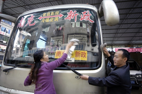 圖為發(fā)往儀隴新縣城新政的客車司機正在做發(fā)車前的準備