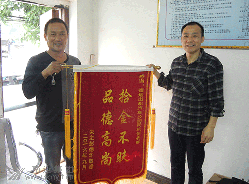 蓬安德運(yùn)出租汽車公司經(jīng)理張洪濤(右)接過(guò)失主送來(lái)的錦旗