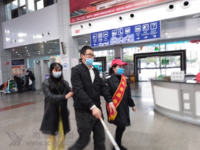 11月13日,寒風(fēng)陣陣,天空下著小雨,明顯比前幾天冷了許多。八點(diǎn)十分左右,兩位旅客站立在南充汽車客運(yùn)站售票廳門口,神態(tài)異常、焦急萬分,該站愛心班站務(wù)人員強(qiáng)燕和鄧雙發(fā)現(xiàn)后立即上前詢問,通過面對(duì)面觀察交流,得知兩位旅客都是盲人,他們乘坐出租車來到車站,準(zhǔn)備坐9;30前往隆昌的班車。由于出租車司機(jī)把他們送到站前廣場(chǎng)就離開了,一時(shí)之間,他們不知道該往哪里去。身邊又無人陪同,強(qiáng)燕和鄧雙了解情況后,立即開展幫扶行動(dòng),一個(gè)攙扶兩位盲人旅客,一個(gè)用愛心推車將他們的行李搬到推車上,通過安檢直接推送到候車室暫時(shí)休息。 九點(diǎn)十分,兩位站務(wù)人員提前通過綠色通道,將兩位盲人旅客送進(jìn)站臺(tái)攙扶上車,裝好行李。并告訴駕駛員這兩位旅客的情況,再三叮囑一定要把這兩位盲人旅客送到接站的家人手里。 愛心班站務(wù)人員細(xì)心周到的服務(wù),讓這兩位盲人旅客感激不已,坐上車后,他們緊握著愛心班工作人員的手說道:“謝謝,謝謝你們了!”“不用謝,這是我們應(yīng)該做的!睆(qiáng)燕和鄧雙異口同聲的回答道。目送著班車的發(fā)出,她們又立即返回到自己的工作崗位上,準(zhǔn)備為下一位旅客服務(wù)。 真誠做人、平凡善舉、用心做事,踐行服務(wù)至上的理念,用愛溫暖旅客回家路,是該站愛心班每位成員的優(yōu)良傳統(tǒng)。 (李利 陳春華)