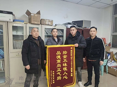 經(jīng)公司多方努力,成功聯(lián)系到失主并將手提包歸還。失主彭先生非常感激,對張超熱情服務(wù)和高尚品德給予高度評價,并于2月19日給張超贈送了一面寫有“拾金不昧暖人心  品德高尚正氣揚”的大紅錦旗,以表謝意。