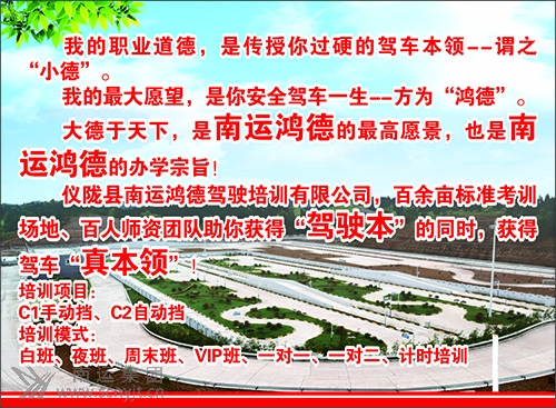 儀隴縣南運鴻德汽車駕駛培訓有限公司是由四川南充汽車運輸(集團)有限公司獨立投資,2015年6月18日經儀隴縣市場監(jiān)督管理局注冊成立的一家集駕駛培訓及考試為一體的培訓公司。 儀隴縣南運鴻德汽車駕駛培訓有限公司(原四川南充汽車運輸(集團)有限公司駕駛培訓學校儀隴分校)始建于1994年,有20多年的豐富辦校經驗和雄厚的師資力量。為了規(guī)范機動車駕駛員培訓教練場地,該司于2015年2月10日競買獲得儀隴縣光華鄉(xiāng)瀠馬公路南側宗地97.4畝用于建設駕校及考試中心。規(guī)劃總建筑面積10433.89 ㎡,投資9000余萬元。2015年7月開工,2017年6月已完成綜合樓、考試中心房建8245 ㎡、訓練場地硬化面積約為42000 ㎡、綠化15000 ㎡,已通過竣工驗收。實現了訓練和考試一體化,對推動駕校招生規(guī)模的進一步擴大,為駕校提高教學質量、占領駕培市場提供了保障。 該司現有教練車57臺,駕駛模擬器5臺,整車透明模具1套,教學磁板1套,教學軟件三套,電教板東風EQ140一套、桑塔納一套,安全帶體驗裝置一套,心肺復蘇模擬人一套,掛圖二套,計算機室一間,教學電腦15臺,安全警示教育室一間,理論教室一間,多媒體教室一間。公司主要經營三級普通機動車駕駛員培訓(C1、C2),公司堅持“質量第一,服務至上”的原則,注重駕駛員素質教育,堅決杜絕“吃、拿、卡、要”。弘揚安全教育新理念,樹立“儀隴南運鴻德駕培”特色品牌,追求卓越,科學發(fā)展,以“為社會培養(yǎng)合格的駕駛員”為使命,打造“最值得信賴的培訓公司”為愿景,把公司辦成機動車駕駛員培訓行業(yè)質量好、教學水平優(yōu)、現代化程度高的一流培訓公司,切實做到安全第一、優(yōu)質服務、學員至上的服務標準,最大限度地滿足學員的需要,為社會培養(yǎng)高素質的駕駛人才。 校 長:岳正堂 電 話:0817—7212877 手機:13518288123 培訓中心地址:儀隴縣光華鄉(xiāng)瀠馬公路南側